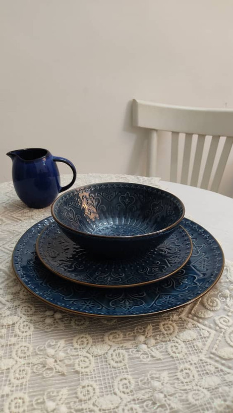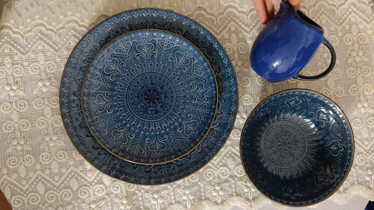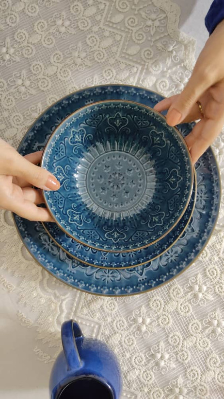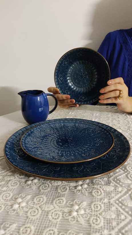 سرویس غذاخوری روستیک رنگ آبی سورمه ای متریال ترکیب سرامیک و پودر شیشه بسیار با کیفیت و زیبا