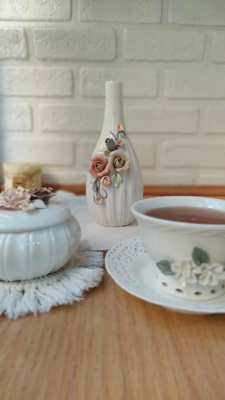 گلدان ست با قندان گل برجسته سرامیکی و بسیار ظریف و زیبا ارتفاع گلدان ۲۵ و قطر قندان ۱۲